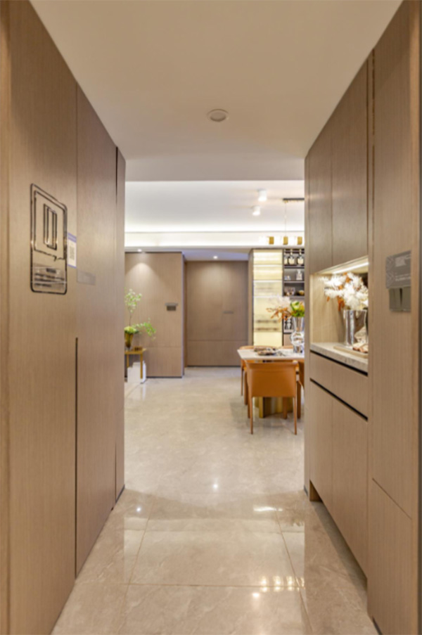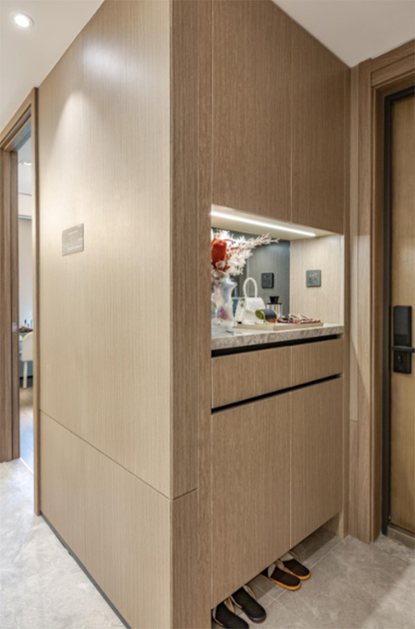 步入玄关,一体化定制柜体消弭结构界限,嵌入式换鞋凳与悬浮储物设计兼顾实用与轻盈感。高精度封边工艺与极简拉手细节,于细微处传递品质生活的仪式感。
