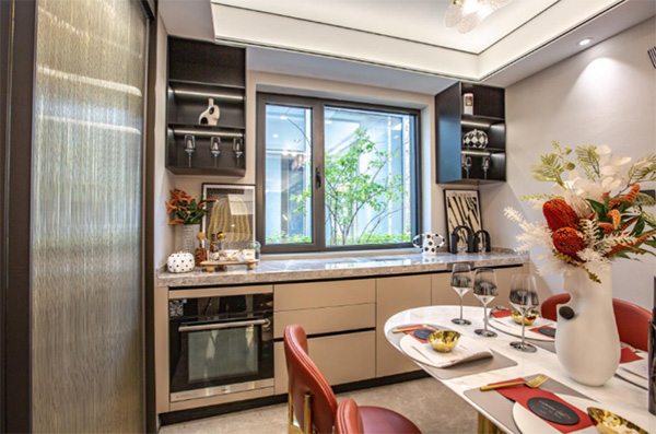 西厨空间则跳脱传统厨房的厚重感,以明亮色彩与原木质感门板激活空间活力。隐藏式收纳与开放展架结合,既满足烘焙器具的高效收纳,又成为展示生活品味的艺术角落。